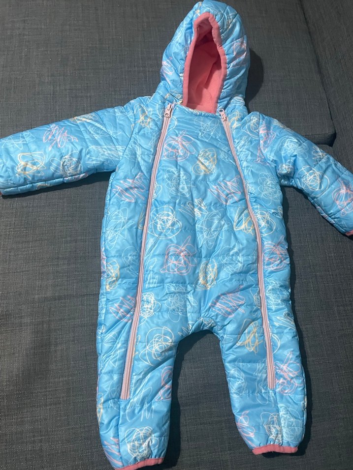 Renkli desenli bebek kız tulumu, notlu yakalı ve çift fermuarlı, kolay giydirme sağlar ve bebeğinizi sıcak tutar. 1 kere giydirildi.E bebekten alındı