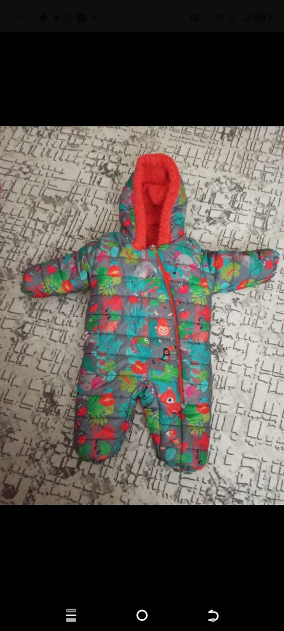 Renkli desenli bebek kız tulumu, kapüşonlu ve fermuarlı. Boğazlı yaka ile ekstra sıcak tutar. Soğuk havalar için uygundur. ❄️