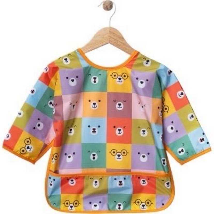 Renkli ve çizgi desenli, uzun kollu, önünde cepli bebek önlüğü.