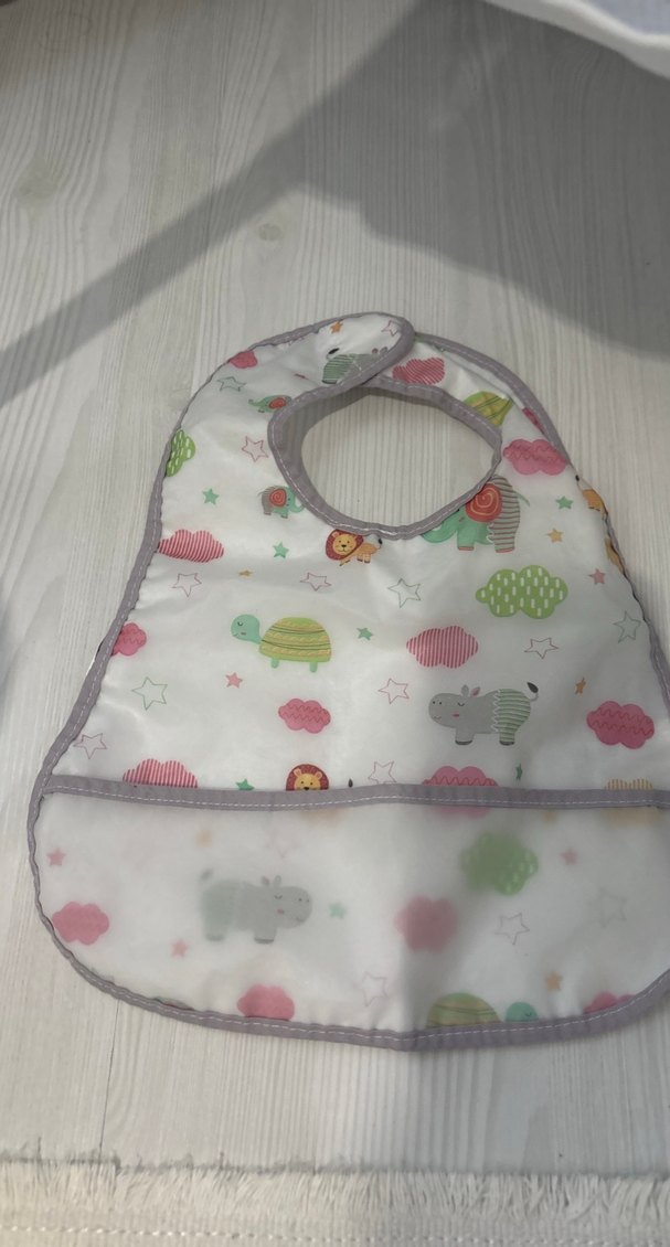 Renkli hayvan ve bulut desenli, yakalama cepli ve yumuşak kumaşlı bebek önlüğü.