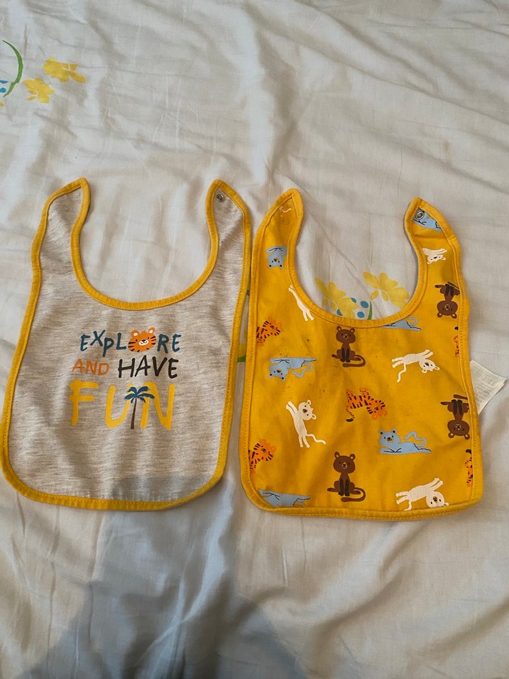 Sarı renkli, üzerinde "Explore and Have Fun" yazısı ve hayvan desenleri bulunan iki renkli bebek önlüğü seti.
