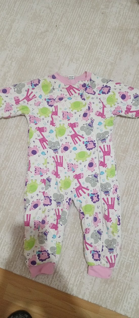 Yumuşak ve sıcak kumaştan yapılmış, renkli hayvan desenleriyle bezenmiş bebek uyku tulumu.