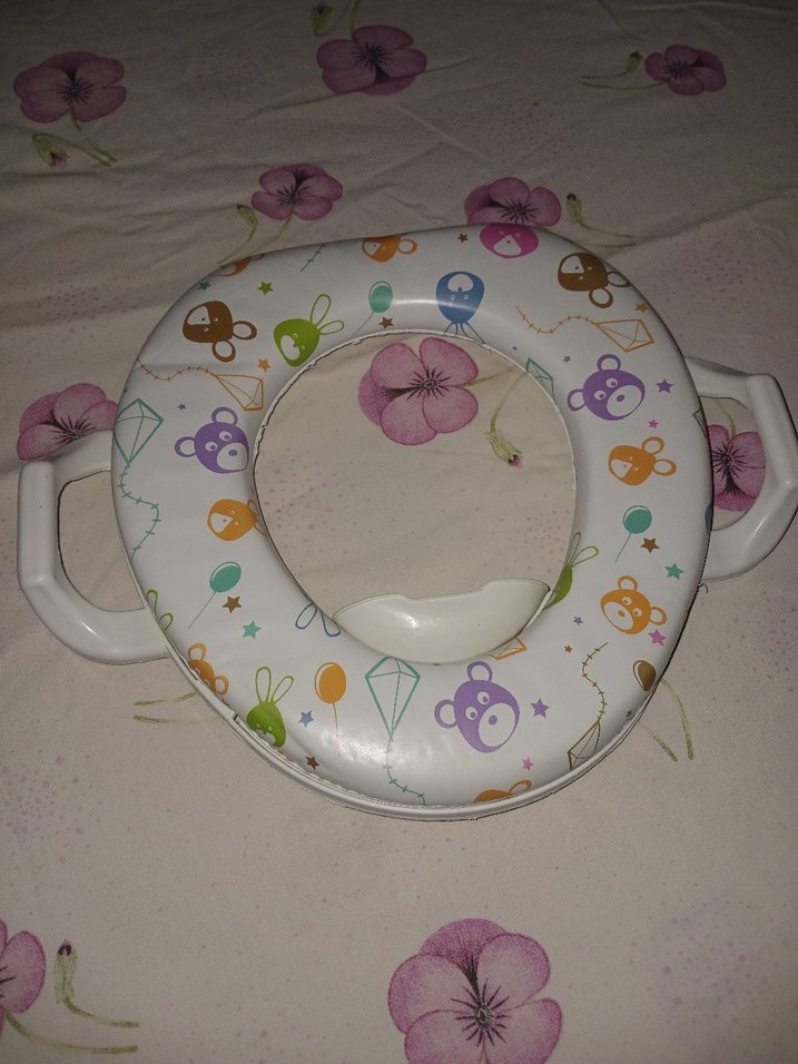Renkli hayvan ve balon desenlerine sahip, kolay tutuş için yan kulplu bebek tuvalet adaptörü. Konforlu ve güvenlidir.