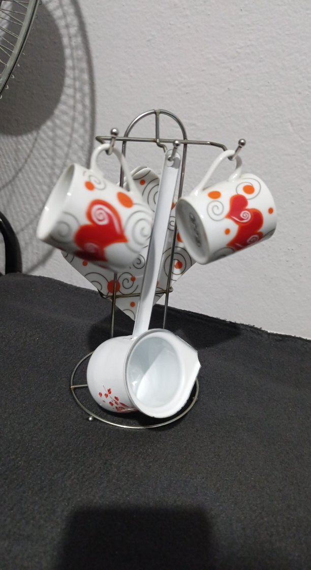 Metal askılı, kırmızı ve turuncu renkli desenlere sahip beyaz 4'lü fincan takımı. Canlı renklerle servis için uygun. ☕