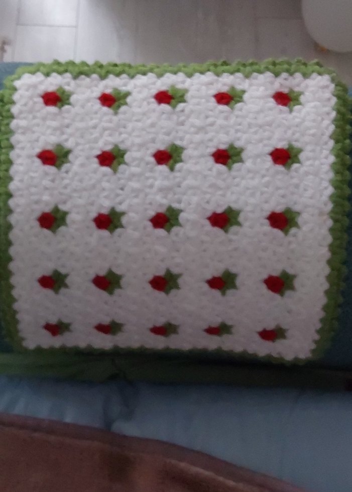 Yumuşak dokulu beyaz banyo süngeri, renkli çiçek desenleri ve yeşil kenarlıkla süslenmiştir.