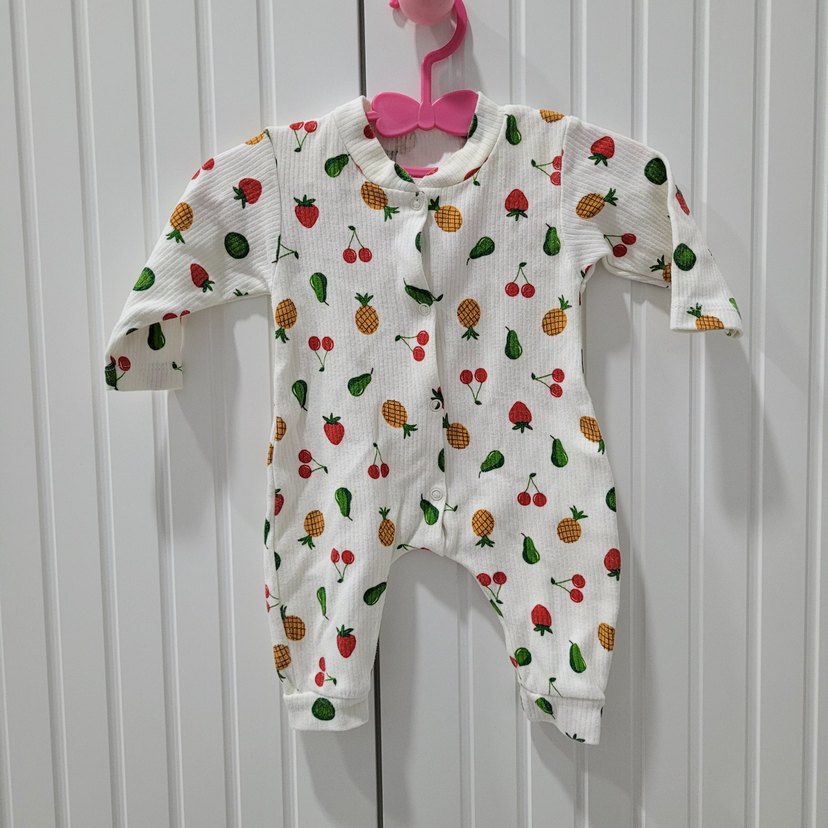 Renkli meyve desenli, düğmeli beyaz bebek kız tulumu. yenidoğan
