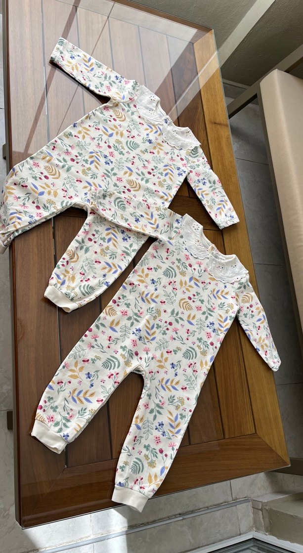 Uzun kollu, renkli desenli beyaz bebek tulumları dantel yakalı ve yumuşak kumaştan üretilmiştir.
