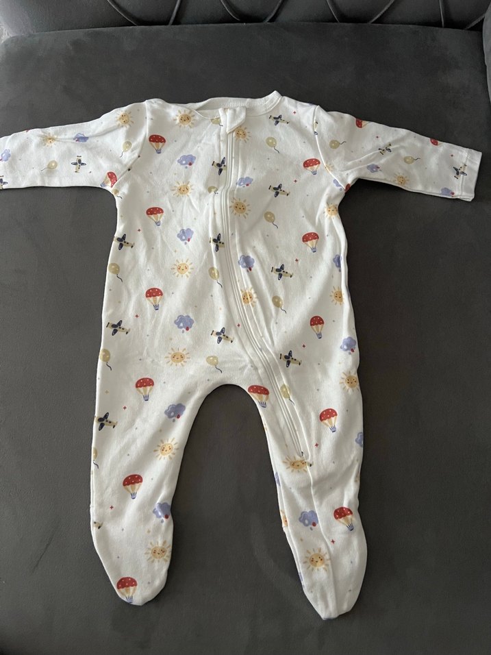 Renkli desenlere sahip beyaz bebek tulumu, fermuarlı, uzun kollu ve yuvarlak yakalıdır. Yumuşak ve sıcak kumaştan üretilmiştir.