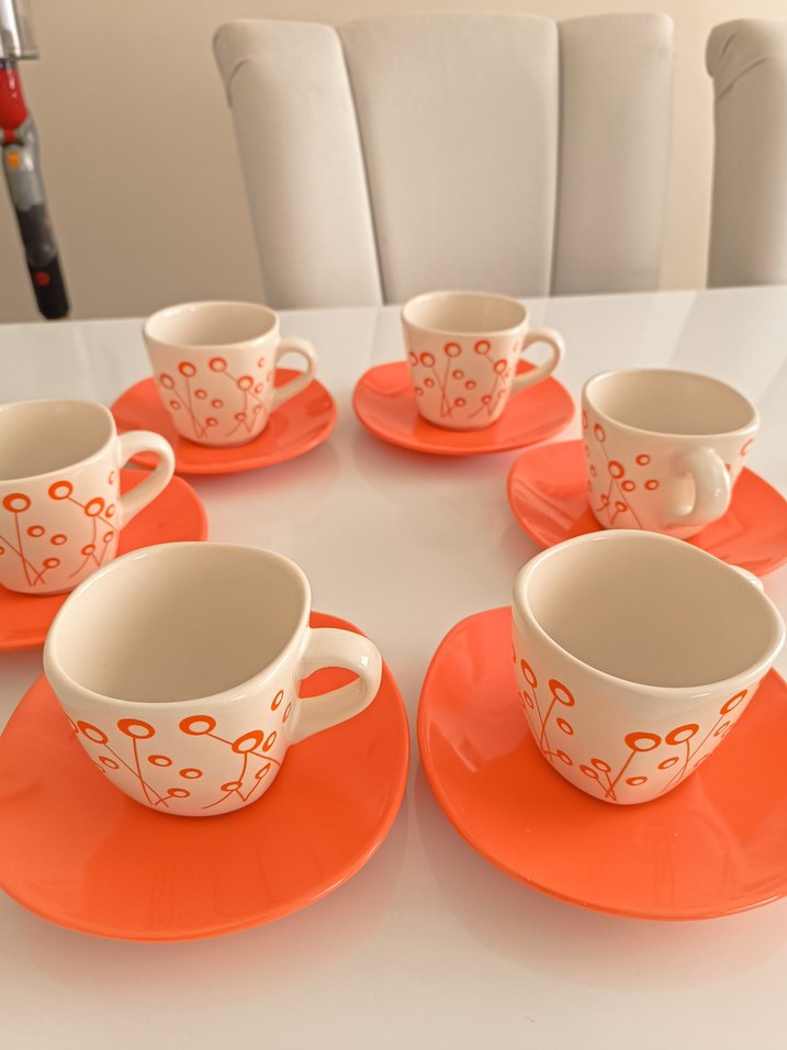 Beyaz kahve fincanları, turuncu renkli desenlerle ve canlı turuncu tabaklarla servis için uygun. ☕