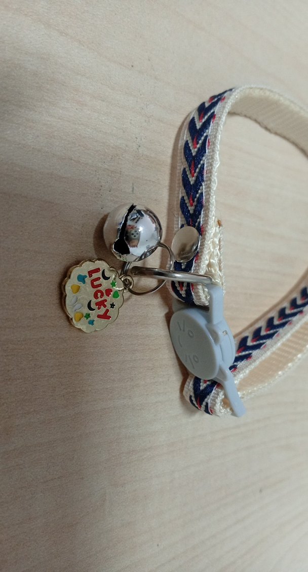 Renkli desenlere sahip beyaz kedi tasması, üzerinde küçük zil ve 'Lucky' yazılı bir charm bulunur.
