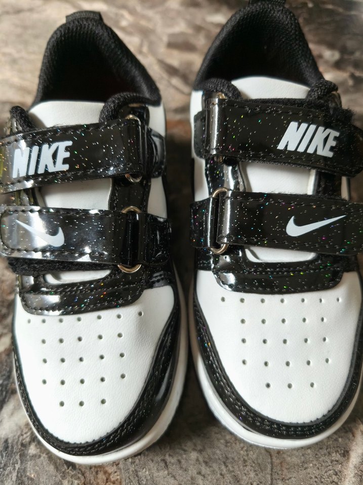kız çocuk spor ayakkabıları, kolay kullanım için cırt cırtlı bantlara sahip. Kauçuk tabanlı, beyaz zemin üzerinde renkli desenler ve siyah detaylar bulunur. "NIKE" ve "TKE" yazılıdır.