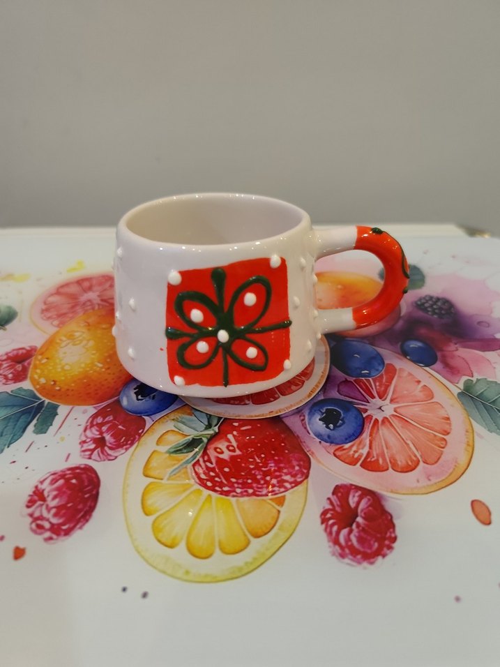 Bu beyaz seramik fincan, renkli kırmızı sapı ve yanındaki çiçek desenleriyle canlı bir görünüm sunar. ☕adet fiyatı