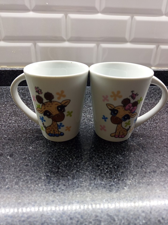 Renkli zürafa desenleri ve çiçek detaylarıyla beyaz seramik kupa seti, günlük kullanıma uygundur. ☕