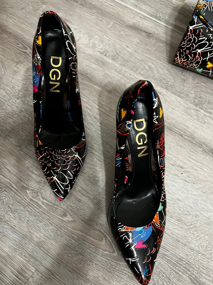 DGN marka, renkli desenli, parlak yüzeyli kadın stiletto. Blok topuklu, sokak stiline uygun günlük kullanım için ideal. Dogan cantadan alindi sorunsuz canta ve cuzdan takimi da vardir hesabimdan fotograflarini bulabilirsiniz 40 numara ve cok rahat bir stiletto agri yapmaz asla agiz kismi genis oldugu icin.