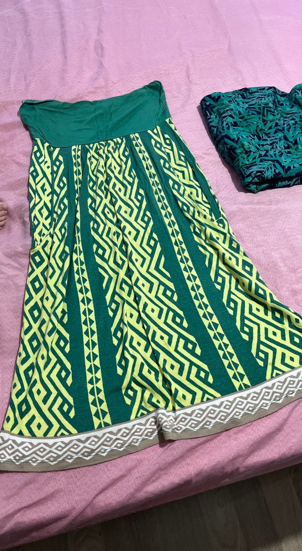 Renkli desenlere sahip, bol kesim ve drapeli detaylı yeşil straplez elbise açık hava bohem tarzı için uygun.