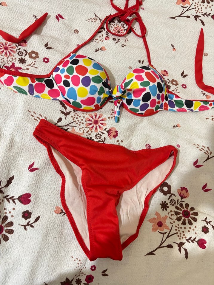 Renkli puantiyeli strappy üst ve kırmızı alt parçadan oluşan, düğmeli, bohem tarzda fit kesim bikini takımı. Plaj için uygun.