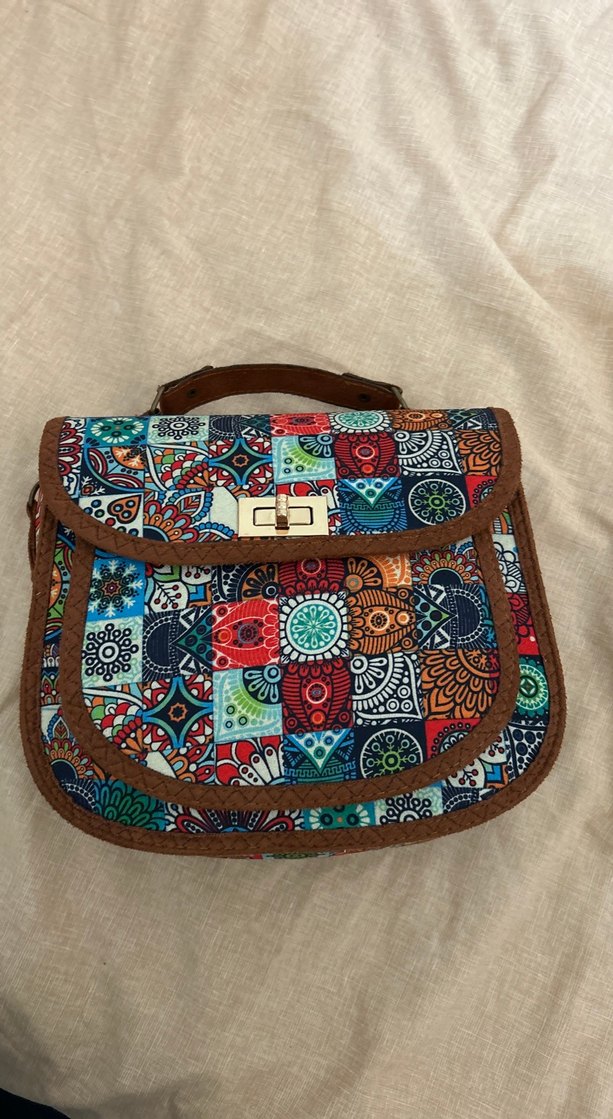 Renkli desenli sentetik kumaştan yapılmış, tokalı kapaklı bohem stil kadın çantası, günlük kullanım için uygundur. el yapımıdır.