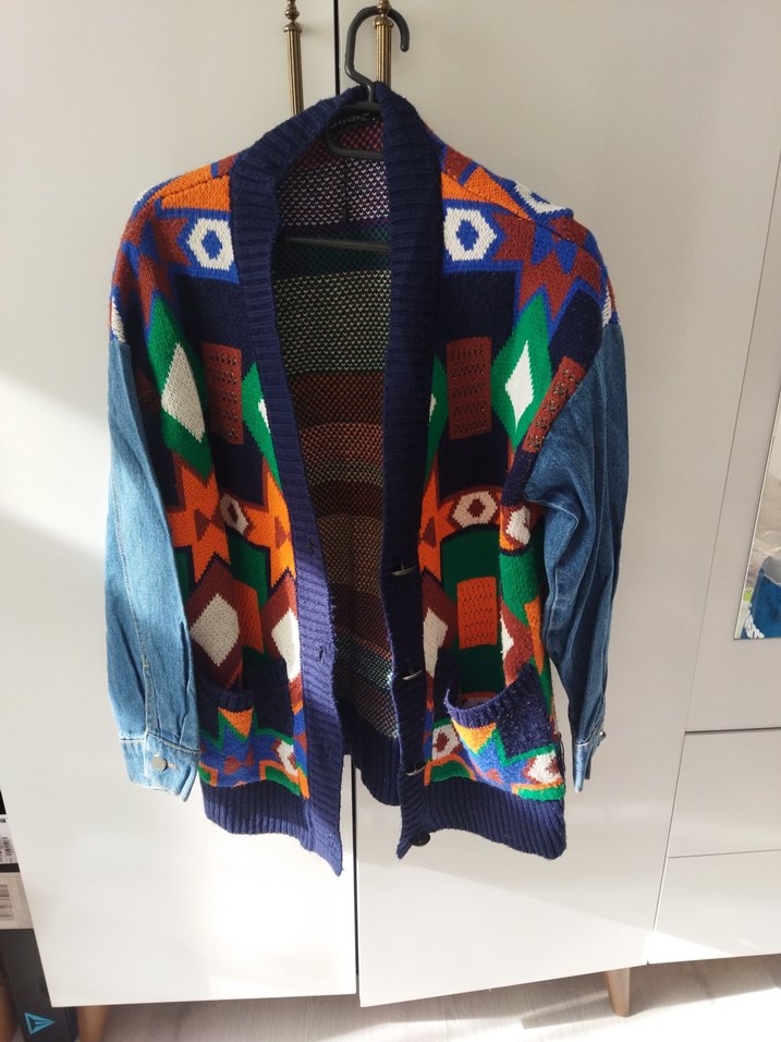 Renkli, desenli ve örme yapıda olan bu kadın hırka, uzun kollu ve yakası açık bohem tarzındadır. Normal midi boyda, bol kesimdir ve günlük kullanım için uygundur.