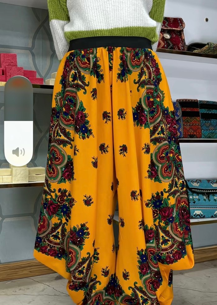 Uzun boy, bol kesim, renkli desenli ve drapeli kadın şalvar , sentetik kumaştan, bohem tarzı için uygun Mardin’den geldi kullanilmamiş .