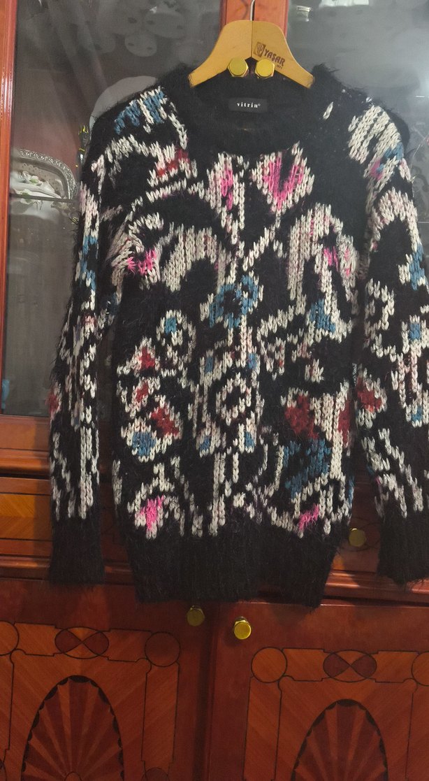 Renkli desenlere sahip, bohem tarzda, uzun kollu, salaş kesim kadın triko kazak. Günlük kullanıma uygun, rahat ve şık bir model.