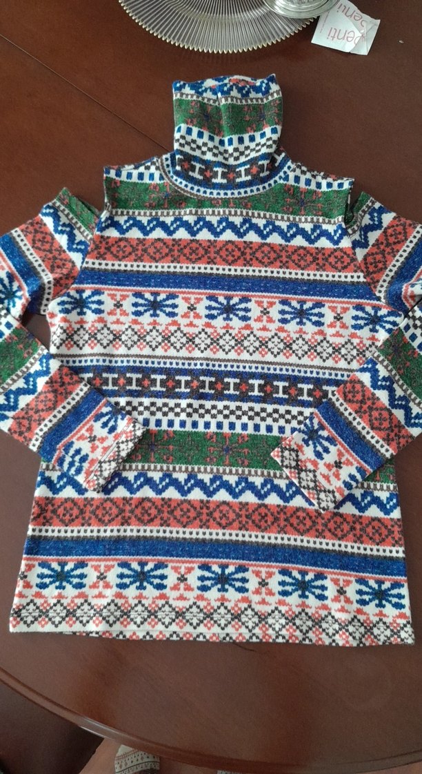 Renkli desenli, bohem tarzda, balıkçı yaka ve uzun kollu, vücuda oturan kadın triko kazak. Yeni, 1 kere giyildi. yumuşak, hafif ve sıcak hissedilir. omuz detayi ile çok şık duruyor.