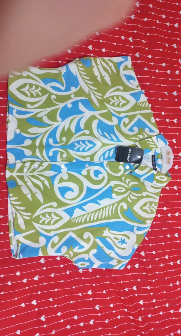 Renkli desenlere sahip, kısa kollu ve tekne yaka, bol kesim kadın gömleği. Yumuşak sentetik kumaştan, düğmeli ve açık hava için uygun.