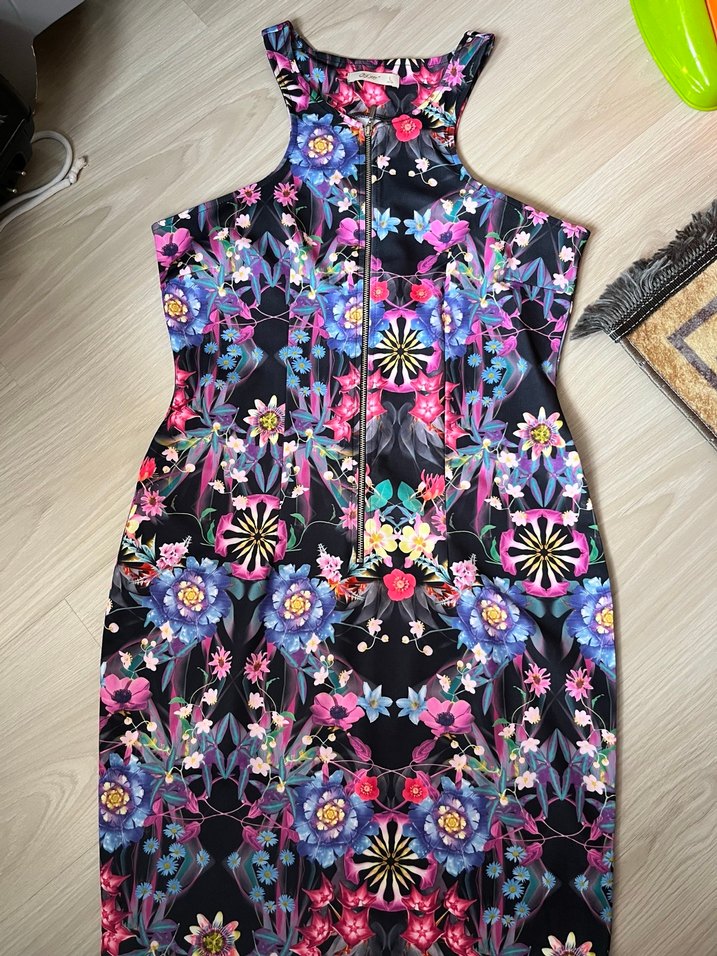 Kolsuz, yüksek yakalı ve önden fermuarlı bu midi elbise, renkli desenli ve sentetik kumaştan yapılmıştır. Bohem parti tarzı için uygundur.
