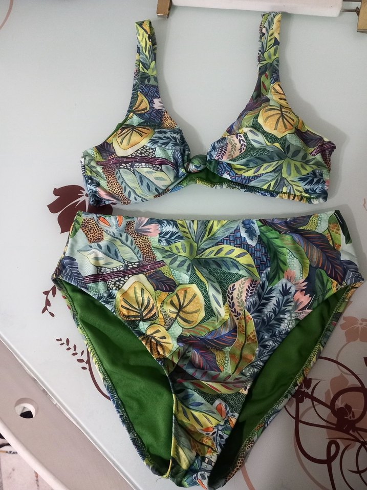 Renkli, desenli, kısa kesim, drapeli ve askılı bohem bikini. Plajda şık ve rahat kullanım için ideal.