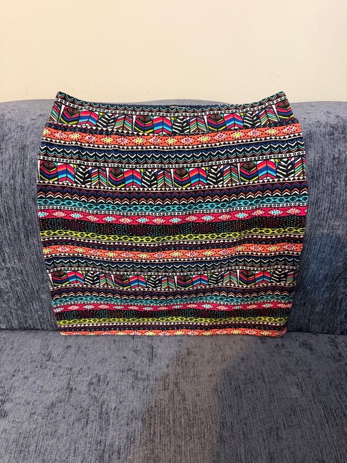 LCW marka. 11-12 yaş mini etek kusuru yok. Renkli, bohem desenli, örme tekstilden yapılmış, vücuda oturan mini etek, günlük kullanım için uygundur.