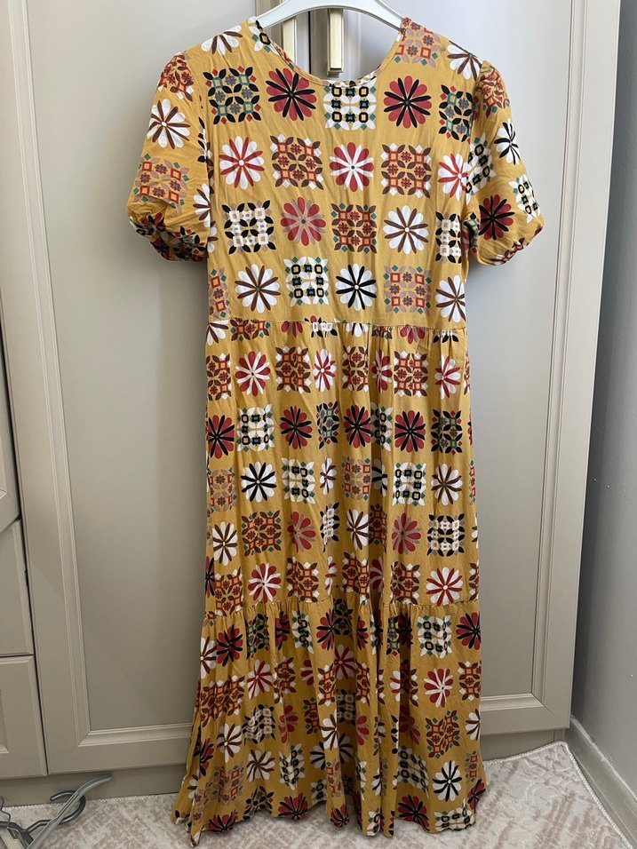 Renkli desenlere sahip bohem uzun elbise, kısa kollu, düğmeli ve bol kesimdir. Yumuşak tekstil kumaştan yapılmıştır, günlük kullanım için uygundur.