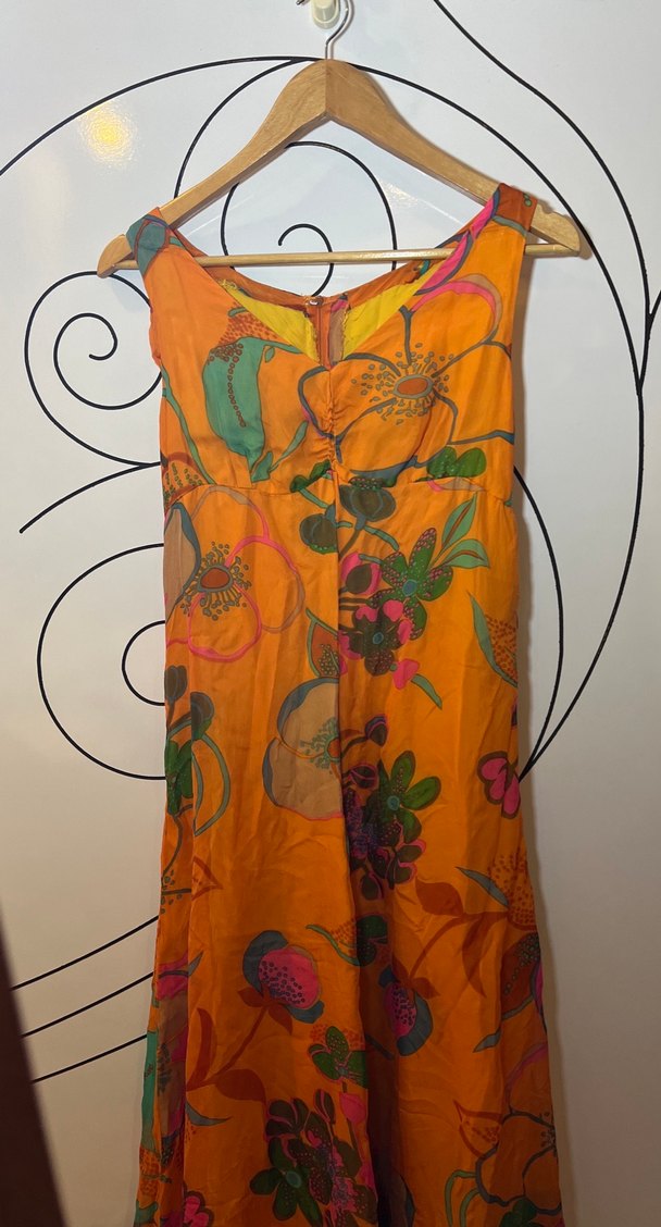 Renkli ve desenli, askısız uzun elbise. İpeksi kumaştan, bol kesim ve bohem tarzda, romantik akşamlar için uygundur.