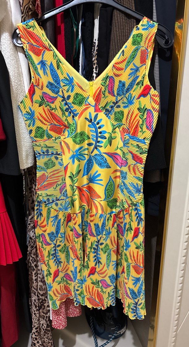 Renkli desenlere sahip bohem tarzda, V yakalı ve kolsuz, sentetik kumaştan yapılmış, pile detaylı, uzun kesim ve vücuda oturan elbise.
