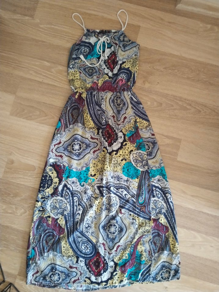 Renkli desenlere sahip, kolsuz bohem uzun elbise. Yüksek yakalı ve bol kesimdir.Göğüs 44 boy askısıyla beraber 125 cm