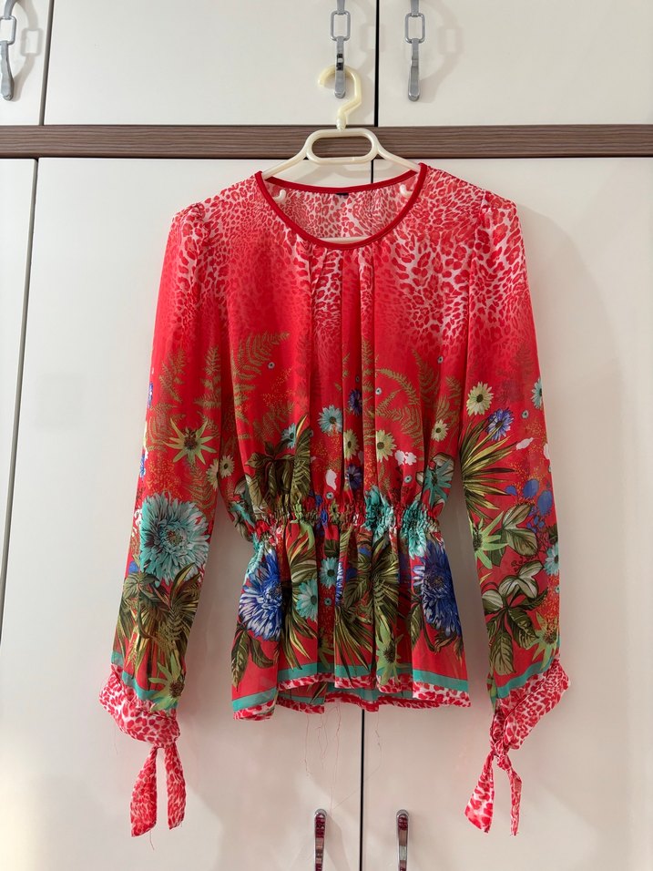 Renkli çiçek ve batik desenli, uzun kollu, drapeli, bol kesim bohem bluz. Sentetik kumaştan, günlük kullanım için uygundur.