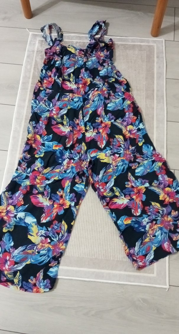 Bol kesim, askılı yaka ve fermuar detaylı, renkli desenli kadın tulumu. Yumuşak pamuklu kumaştan, salaş ve bohem tarzda, günlük kullanıma uygun.