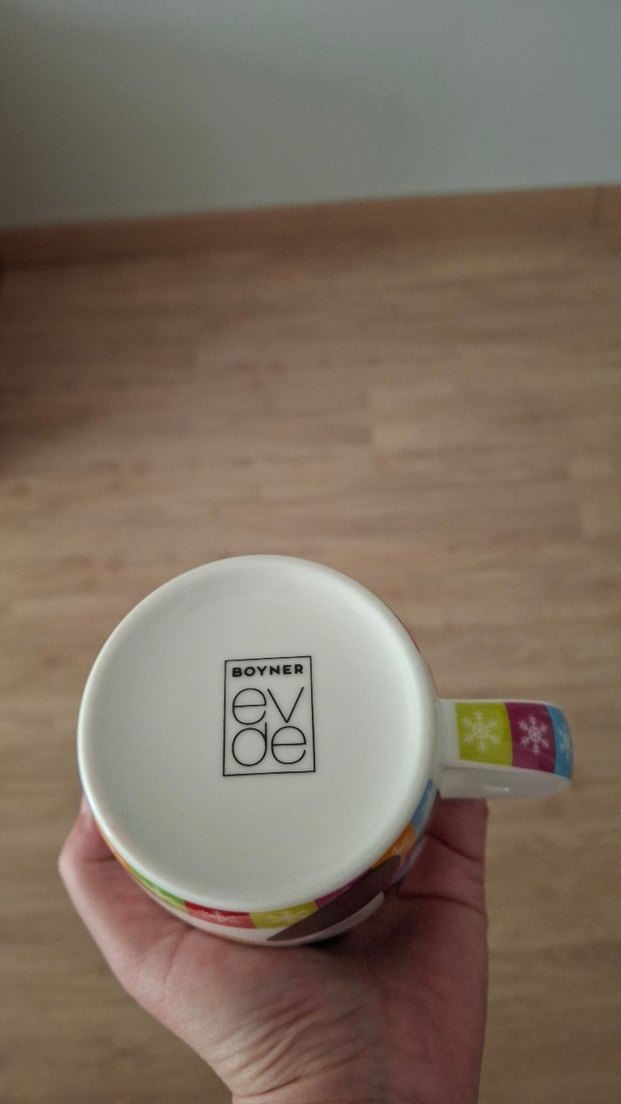 Boyner Evde markalı, kulak ve gövdesinde renkli desenler bulunan beyaz seramik kupa. ☕ BOYNER MARKA HİÇ KULLANILMAMIŞ KUTUSUNDA DURAN KUPA.