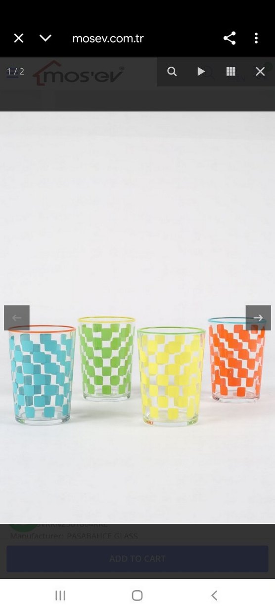 Mavi, yeşil, sarı ve turuncu renklerde kareli desenli cam bardak seti. Her bardağın üst kısmında desene uygun canlı renkli kenar bulunur.