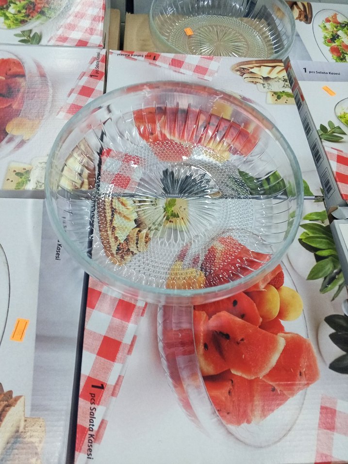 Canlı renklerle desenlendirilmiş şeffaf cam salata kasesi, sofranıza renk katar.