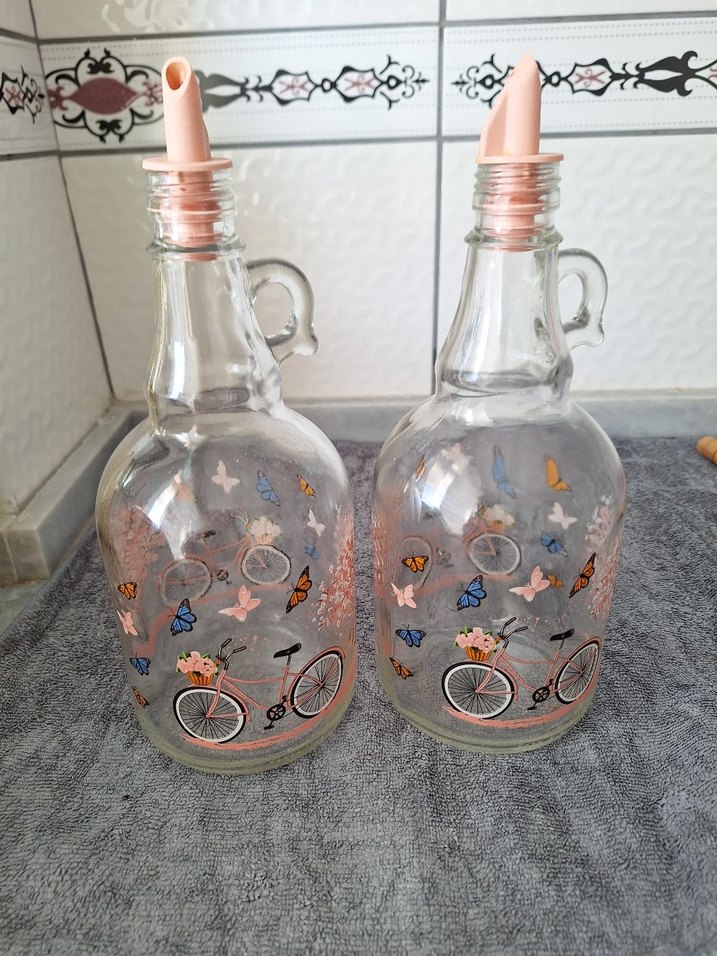 Pembe ağızlığı ve renkli kelebeklerle bisiklet desenleri bulunan iki adet şeffaf cam yağ şişesi seti.