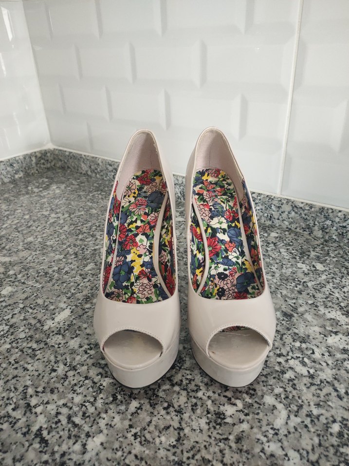 Beyaz platform topuklu, renkli çiçek desenli iç kısmı ve tokalı kayışı ile çağdaş bohem tarzda kauçuk malzeme.