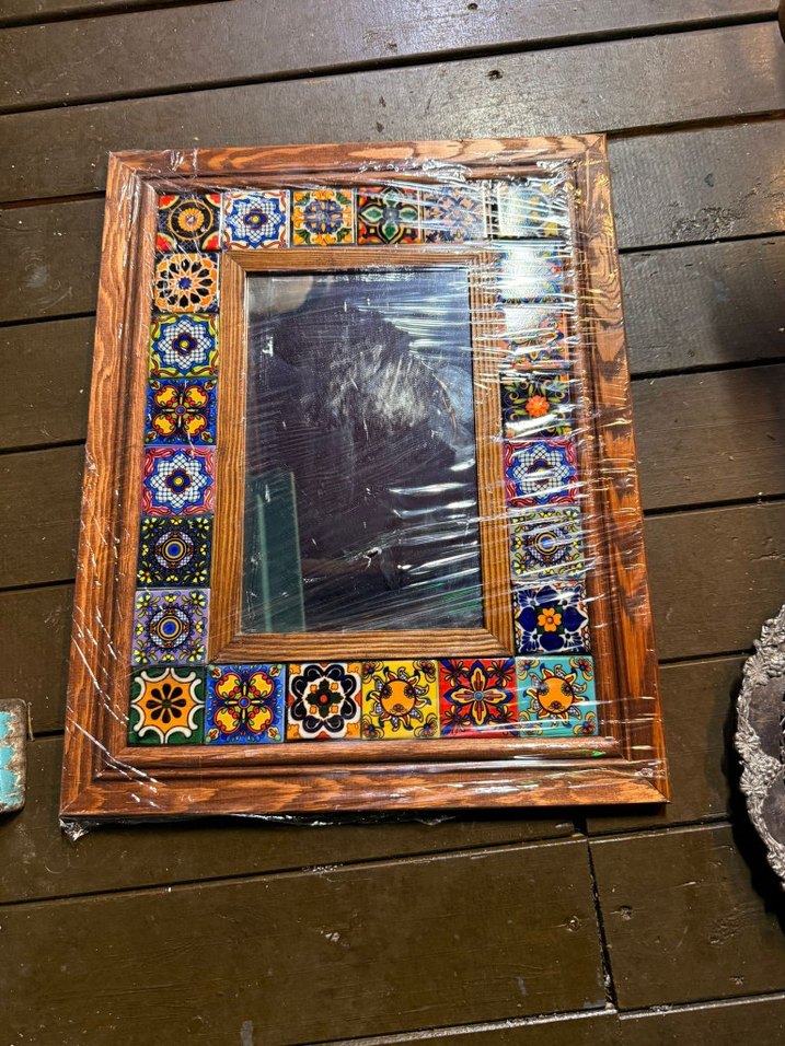 Koyu renkli ahşap çerçeve içinde, etrafı canlı renkli desenli karolarla süslenmiş ayna. Üzerinde koruyucu plastik kaplama bulunur.