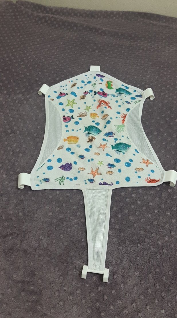 Sentetik kumaştan yapılmış, çok renkli deniz temalı desenlere sahip çocuk küvet filesi ayarlanabilir kayışlarla tasarlanmıştır.