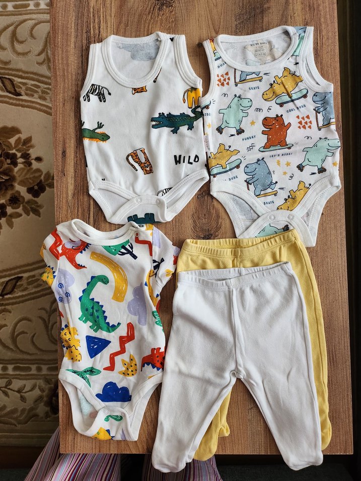 Renkli hayvan desenli, örme kumaştan, kolsuz pamuklu çocuk bodyleri; beyaz ve sarı rahat pantolonlarla birlikte. hepsi 1-3 ay