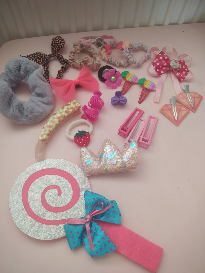 Fiyonk, desenli tokalar ve taç gibi oyuncu tasarımlar içeren renkli çocuk saç aksesuarları seti