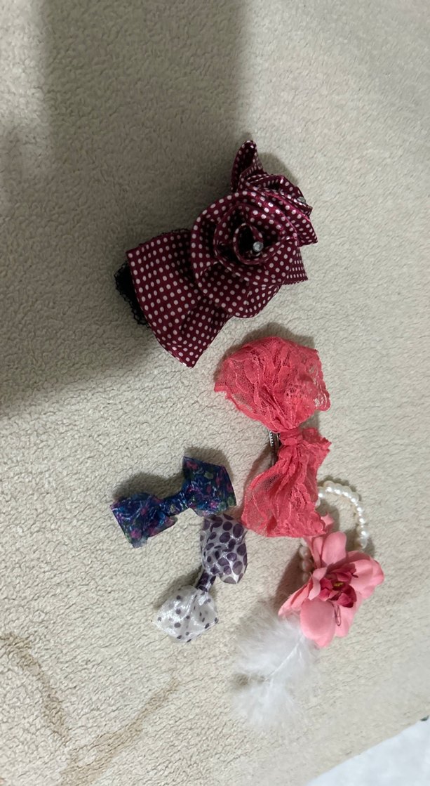 Farklı desenlerde ve renklerde, çiçek ve puantiye desenli fiyonk detaylı çocuk saç tokaları ve bantları.