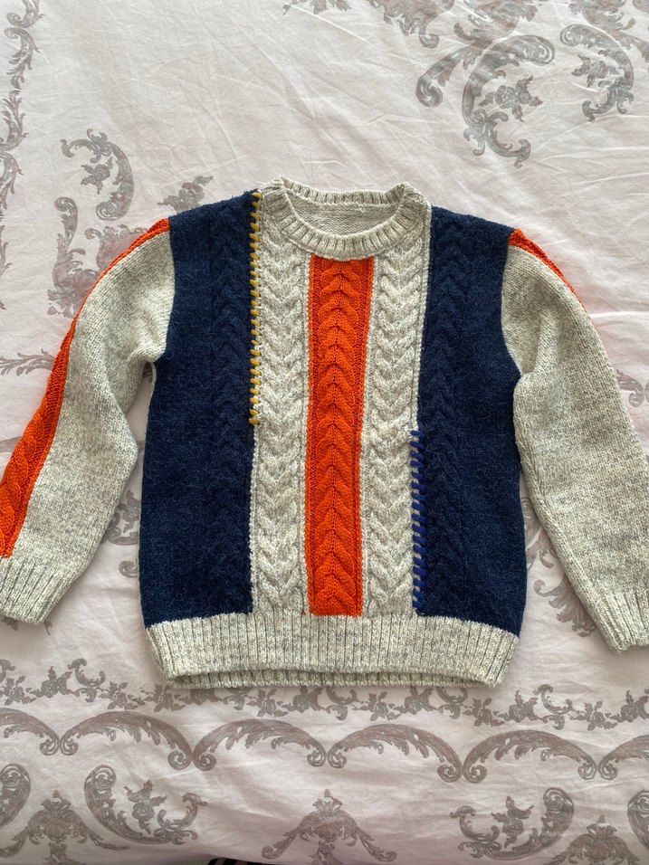 Çocuk triko kazak, yuvarlak yaka ve uzun kolludur. Gri, lacivert ve turuncu dikey şeritlerle renkli desenlidir. Yumuşak ve rahat dokudadır.