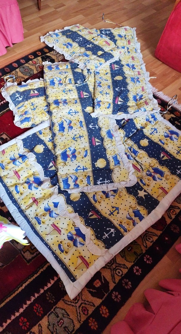 Renkli desenli tekstil malzemeden yapılmış çocuk uyku seti, deniz ve yıldız figürleriyle süslenmiştir. Fırfırlı kenarlarıyla konfor sağlar.