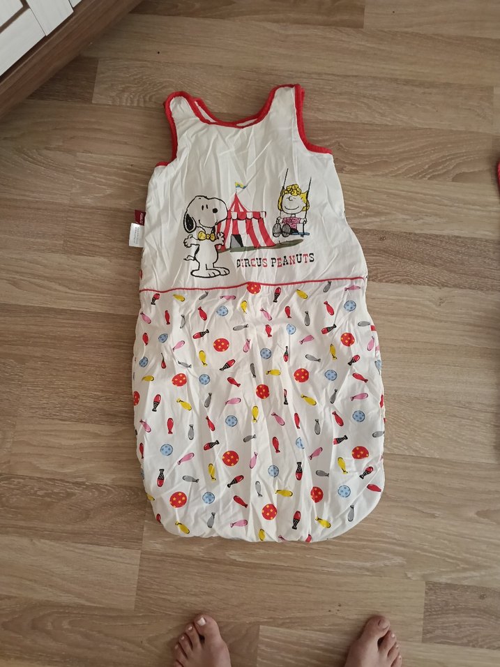 Renkli ve neşeli sirk baskılı, beyaz ve kırmızı detaylı, yumuşak sentetik kumaştan çocuk uyku tulumu.