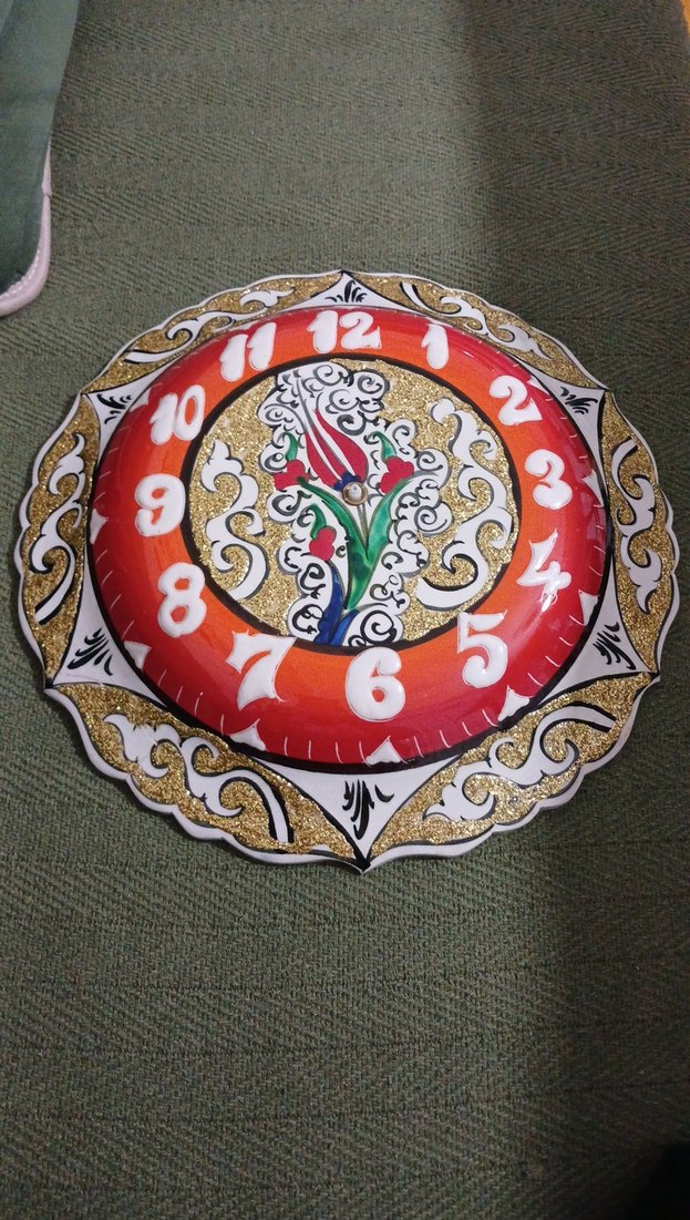 Canlı renklerde çiçek desenli, büyük rakamlı ve süslü kenarlıklı duvar saati.