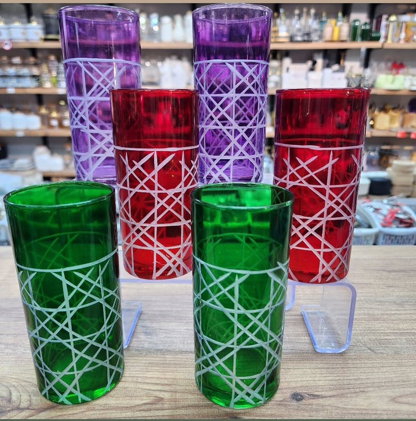 kahve yani vs Yeşil, kırmızı ve mor renklerde, beyaz çapraz desenli uzun cam bardaklar seti. içecekler için uygundur.